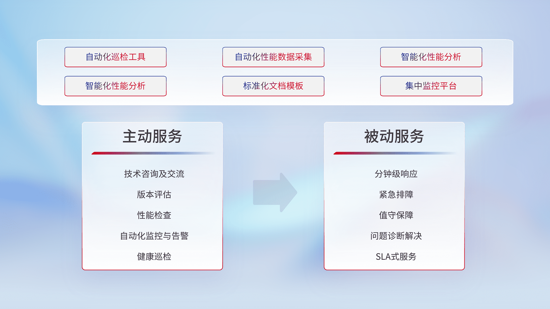 智能化工具和标准化文档,,,,保障服务质量,,,,提供主动服务(包含技术咨询、、、版本评估、、、、性能检查、、、自动化监控与告警、、、健康巡检)和被动服务包含(分钟级响应、、、紧急排障、、、、值守保障、、问题诊断解决、、、、SLA服务)。。